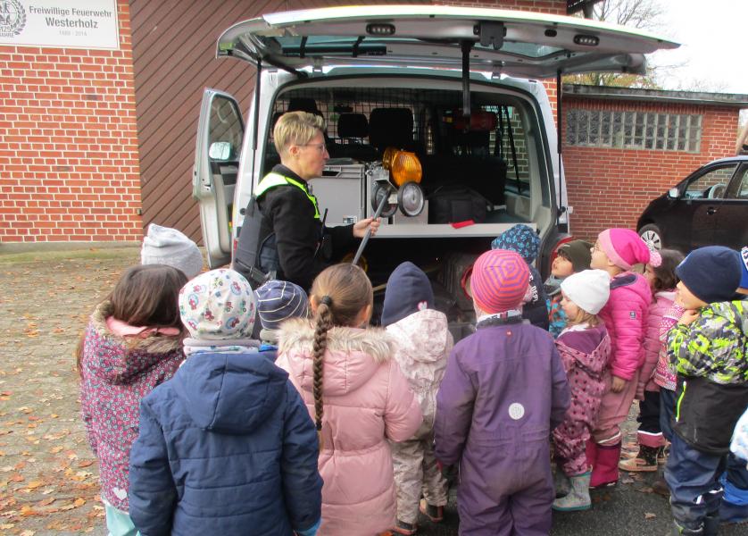 In diesem Jahr wurde aber nicht nur auf die Wichtigkeit der gut sichtbaren Kleidung eingegangen, zusätzlich wurde die Scheeßeler Polizei eingeladen. Sie haben die Verkehrssicherheit der kleinen Räder überprüft damit -der Umwelt zuliebe- für die oft kurzen Wege zur Kita häufiger das Fahrrad genutzt wird. In kindgerechter Form berichteten die zwei Polizist/innen von ihrer täglichen Arbeit und die Kinder hörten gespannt zu, durften Fragen stellen, in den Polizeibus klettern und sogar das Blaulicht einschalten. Zum Schluss konnte jedes Kind sein Fahrrad vorzeigen und wer mochte seine Fahrkünste präsentieren. Da es an den Laufrädern und Kleinrädern meistens keine Lichtanlage gibt, sollte es zur Sicherheit mit Stecklichtern nachgerüstet werden. Alle Kindergartenkinder waren sehr stolz als ihre Eltern sie mittags abholten und sie ihnen ihre „Verkehrssicherheitsaufkleber“ an den Rädern präsentieren konnten.