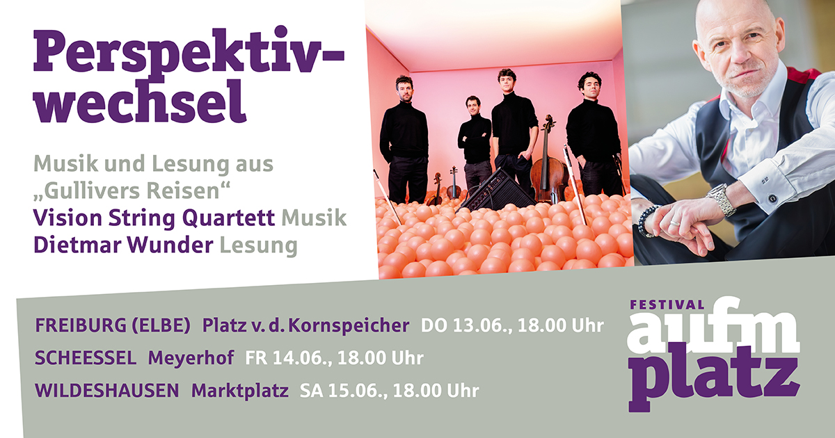 Am Freitag, den 14. Juni, um 18 Uhr, bespielt das „Festival aufm Platz“ den Meyerhof in Scheeßel: James-Bond-Stimme Dietmar Wunder und das Vision String Quartet bringen das Programm „Perspektivwechsel“ auf die mobile Bühne, mit Auszügen aus „Gullivers Reisen“ und Musik zwischen Klassik und Pop. „Festival aufm Platz“, eine Gemeinschaftsveranstaltung der Niedersächsischen Sparkassenstiftung und der VGH Stiftung, präsentiert hochkarätige musikalisch-literarische Programme in lockerer Atmosphäre, umsonst und draußen.