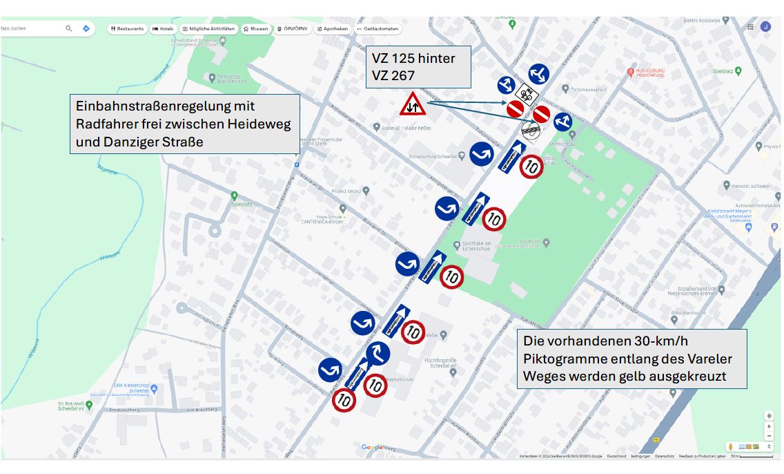 Vom 22.04.2024 bis zum 30.10.2024 werden aufgrund des Neubaus des Busbahnhofs mehrere Verkehrsbeschränkungen im Vareler Weg (zwischen Danziger Straße und Heideweg) auftreten. Der gesamte Parkplatz wird gesperrt, Halteverbotszonen und Einbahnstraßenregelungen in Teilbereichen mit Radfahrer frei werden eingerichtet sowie Geschwindigkeitsbegrenzungen auf 10km/h. Ersatzhaltestellen werden auf vorhandene Parkbuchten im Vareler Weg aufgestellt.