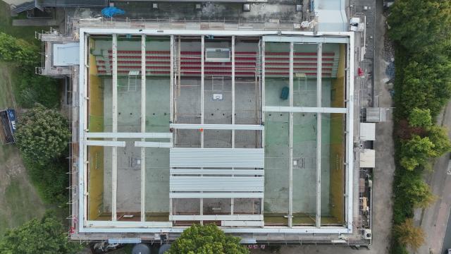 Im April dieses Jahres wurde mit den weiteren Bauarbeiten zur energetischen Sanierung der Sporthalle der BeekeSchule im Vareler Weg begonnen. Die Fassade wurde wärmegedämmt und die Außentüren und -fenster erneuert. Die Dacheindeckung samt Wärmedämmung wird erneuert. Bei der Entfernung der alten Dachplatten wurde jedoch deutlich, dass die mehr als 50 Jahre alten Spannbetonbinder Schäden aufweisen, die nicht reparabel sind. Nach statischer Überprüfung und Beratung mit Fachingenieuren wurde entschieden, die alten Betonbinder zu entfernen und durch neue Leimholzbinder zu ersetzen. Derzeit werden die vorbereitenden formellen Verfahrensschritte bearbeitet. Sobald diese beendet sind, werden die Arbeiten fortgesetzt, um das Dach möglichst bald wieder zu schließen und die Halle vor Witterungseinflüssen zu schützen. Der ursprüngliche Bauzeitenplan verschiebt sich dadurch leider um mehrere Wochen, aber der Austausch der Dachbinderkonstruktion ist tatsächlich alternativlos. Die Fördermittel, die die Gemeinde für die Sanierung der Sporthalle erhält, sind dadurch nicht gefährdet. (Foto: D. Mittelstädt)