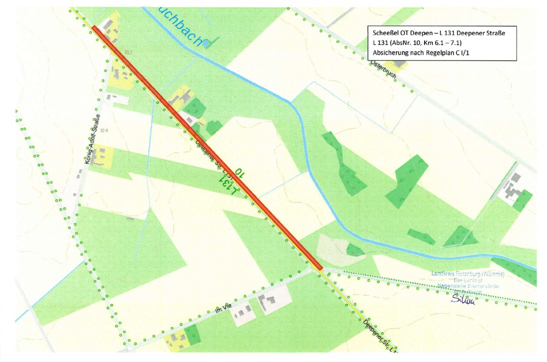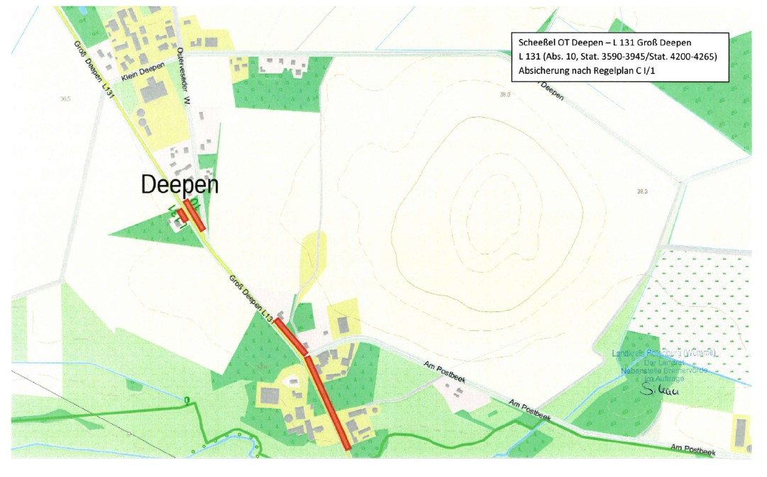 Vom 12.05.2025 bis zum 11.07.2025 kommt es zu Sicherung von Seitenräumen auf der Landstraße L 131 Groß Deepen und Deepener Straße. Grund hierfür ist der Ausbau von Hausanschlüssen und der Trassenausbau im Auftrag der EWE Netz.