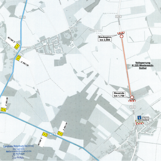 Vom 08.12.2025 bis zum 14.12.2025 wird aufgrund von Fahrbahnerneuerungen die Dorfstraße zwischen Westeresch und Sothel voll gesperrt.
